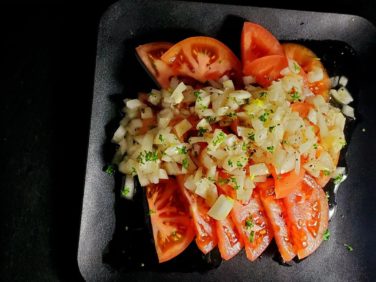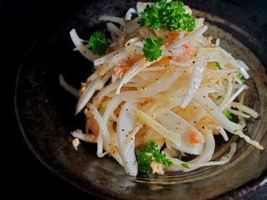 博多トマトは、その色合いの濃さと甘みの強さが特徴です。この旬の食材を活かした一品、「博多トマトと玉ねぎのサラダ」は、シンプルで素材を存分にお楽しみいただける一品です。