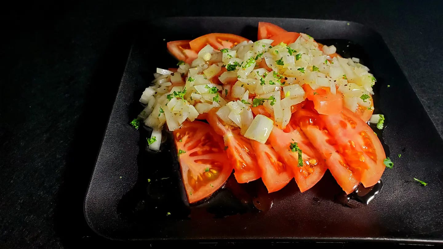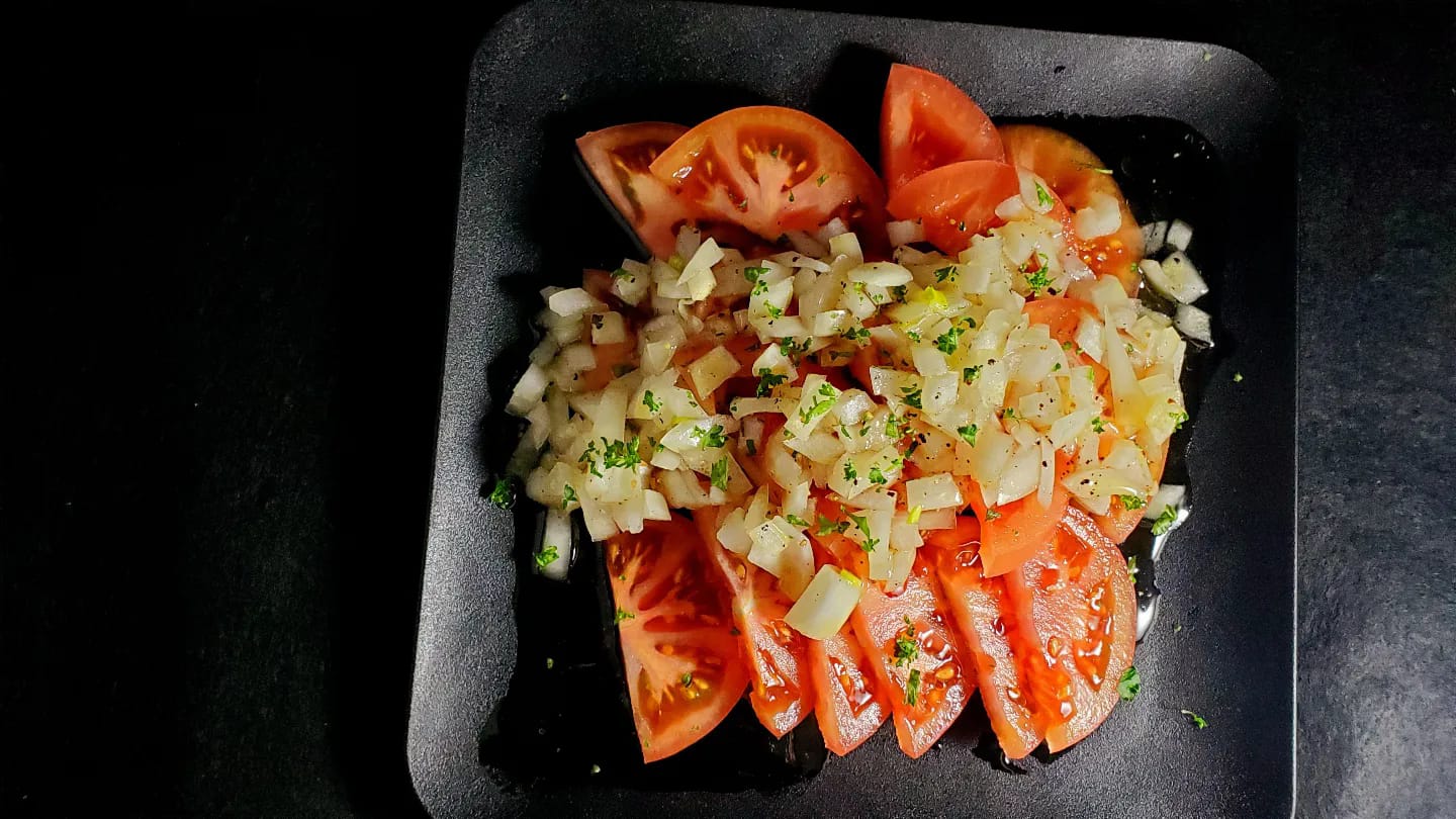 トマトと玉ねぎのシンプルな組み合わせですが、オリーブオイルと酢がさわやかです。塩と黒胡椒で味をととのえ、パセリを加えて風味を引き立てることで、さらに美味しさが増します。お楽しみください!